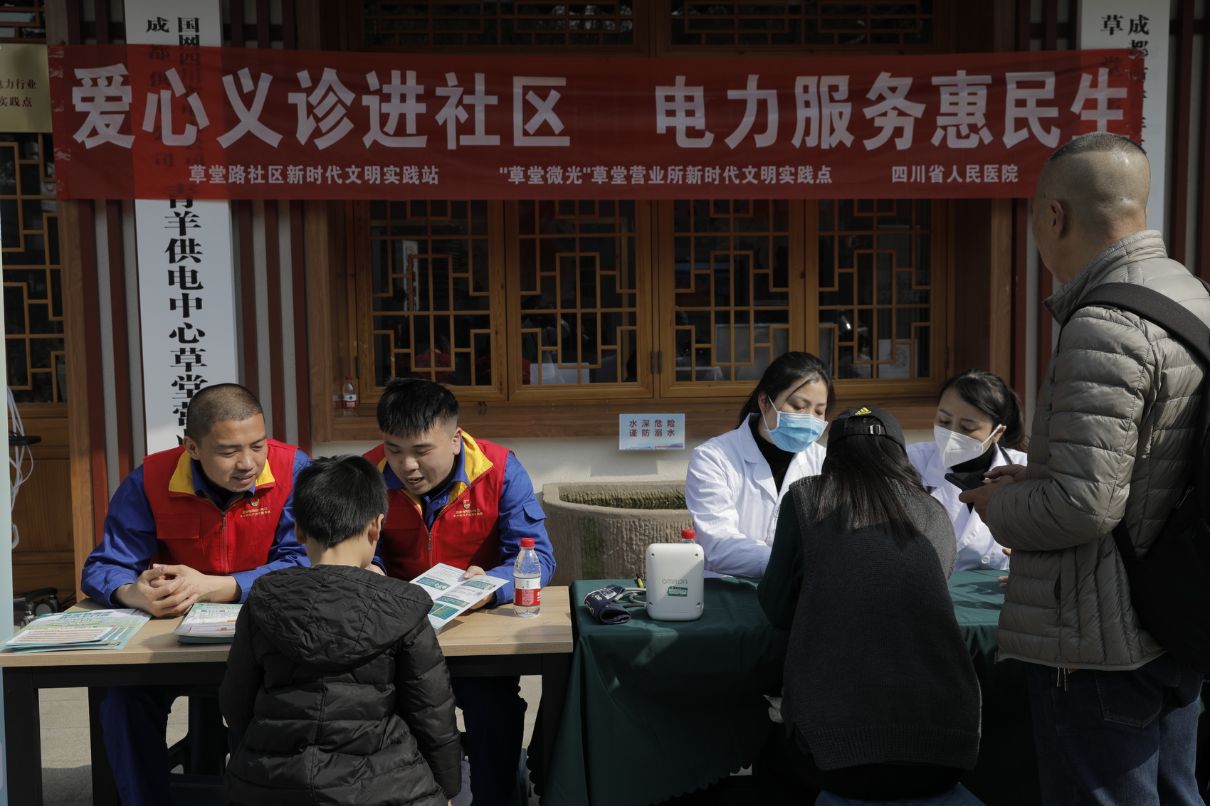 成都青羊草堂供电营业所与草堂路社区、四川省人民医院健康管理中心联合开展“爱心义诊进社区 电力服务惠民生”文明实践活动。国网成都供电公司供图