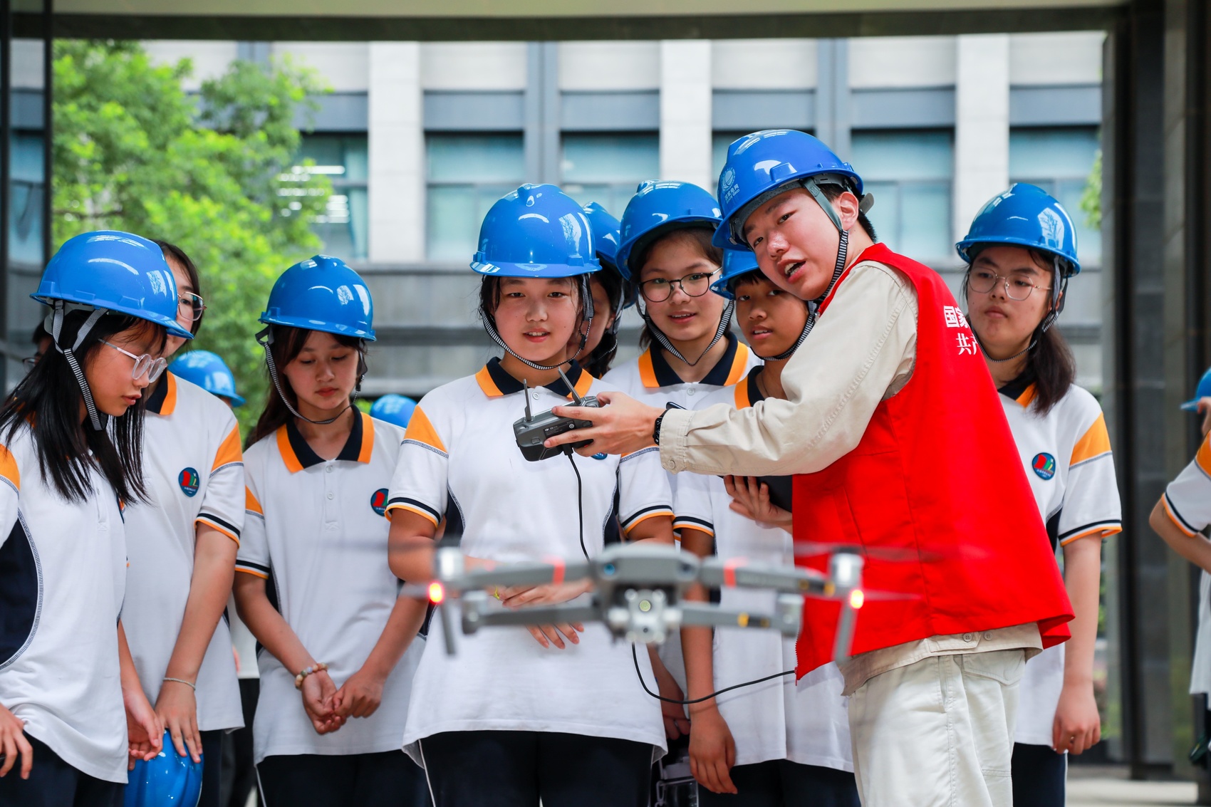 国网江苏电力(无锡何光华)共产党员服务队为学生讲解无人机知识,并为其进行操作示范。 国网江苏电力供图