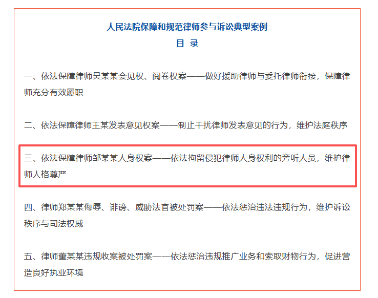 庭审结束后,代理律师正在核对笔录,不曾想遭到一名旁听人员的袭击……该名旁听人员姚某,不仅当场被法官训诫,后来还被拘留3日。今日,最高法院发布五起保障和规范律师参与诉讼典型案例,上述由绵阳中院办理的依法保障律师邹某某人身权案在列。