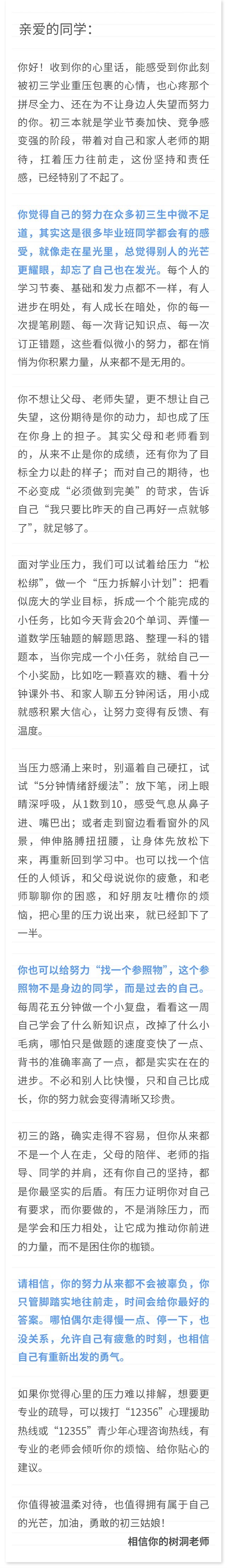 15岁初中女生:作为初三生,学业压力拉满,压力值8分,觉得自己的努力在众多同学中微不足道,既不想让父母、老师失望,更不想让自己失望,希望得到一些建议。