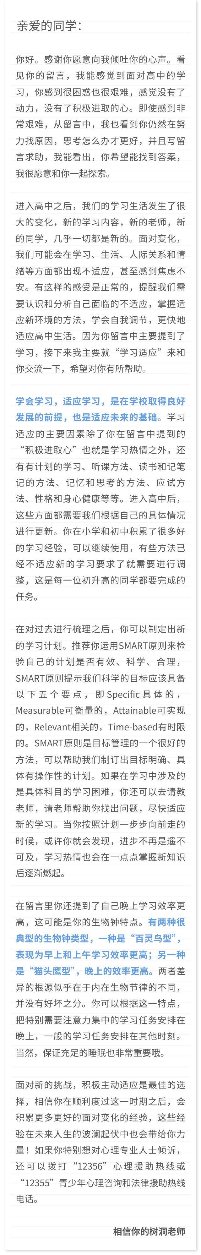 17岁高中女生:到了高中感觉没有了动力,没有了积极进取的心。在初中、小学的时候都是积极进取,怕朋友的成绩比自己高,就非常努力刻苦。到了高中,感觉一切都平淡无奇,平平淡淡,小时候初中时候的动力没有了。同时每次想到如果不想学的后果,心里就非常害怕,想着如果我失败了,是不是很丢人?在班里是不是很落后,是不是被认为假装努力,假努力,那不也更丢人了吗?会不会考不上大学、大专,甚至拿不到高中毕业证?还有觉得晚上比白天效率高、学习状态更好,但又担心熬夜影响第二天的学习。心里好困惑。