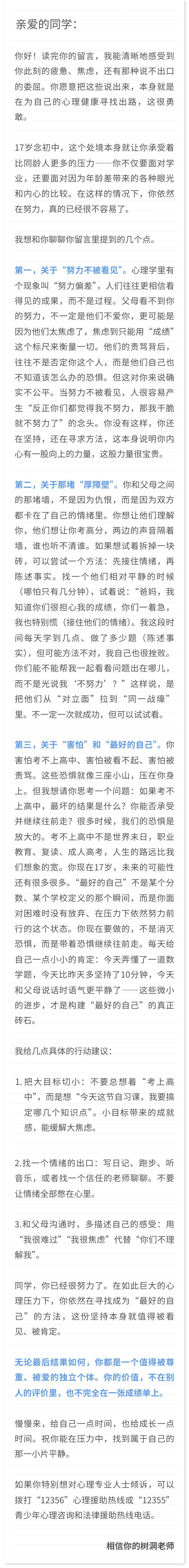 一位17岁的初中女生:我明明很努力地在学习了,但是父母一直觉得我没努力,成绩也不理想,我真的好烦、心理压力太大、害怕考不上高中、害怕被看不起、害怕父母的责骂、因为学习与年龄我与父母之间也有了个厚障壁。唉,到底要怎么做才能得到最好的自己?