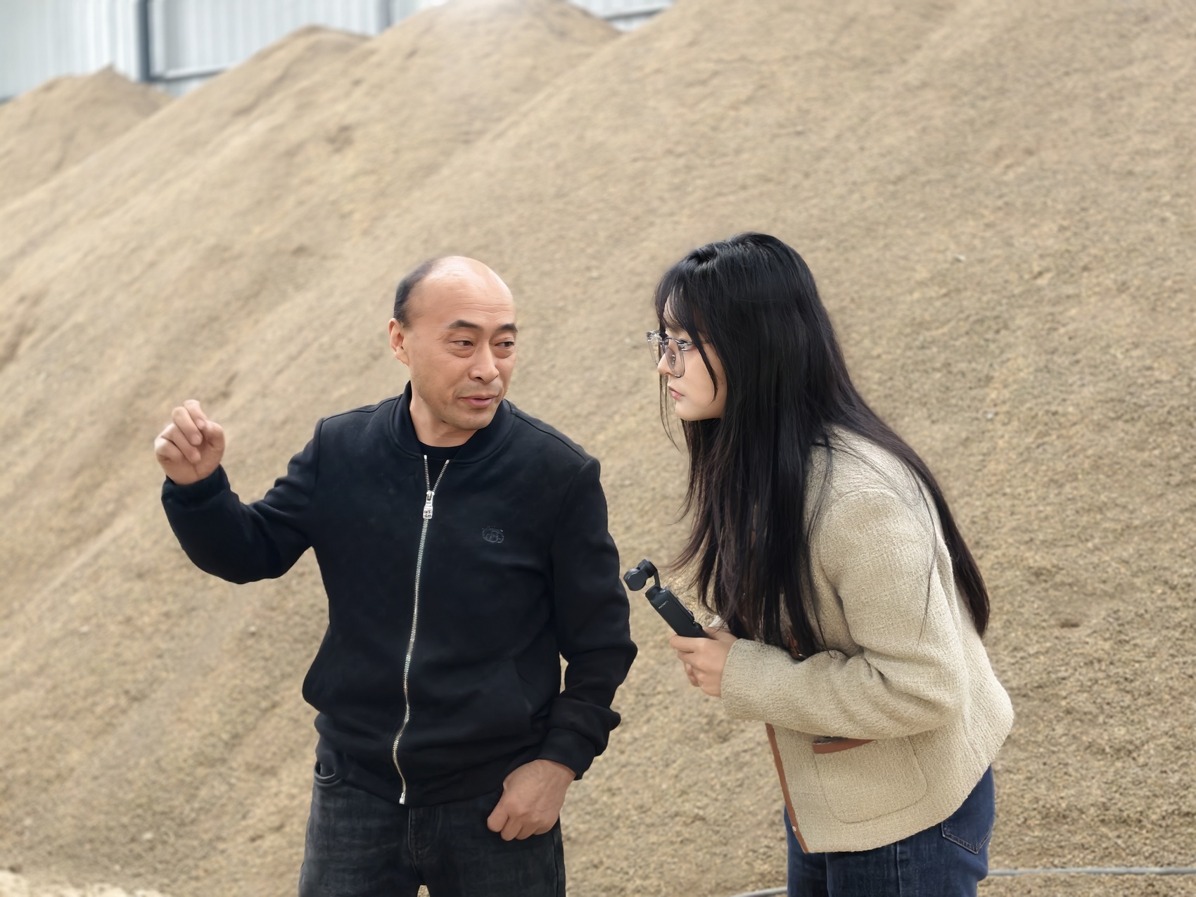 易定良(左)向记者介绍拌土机自制过程。
