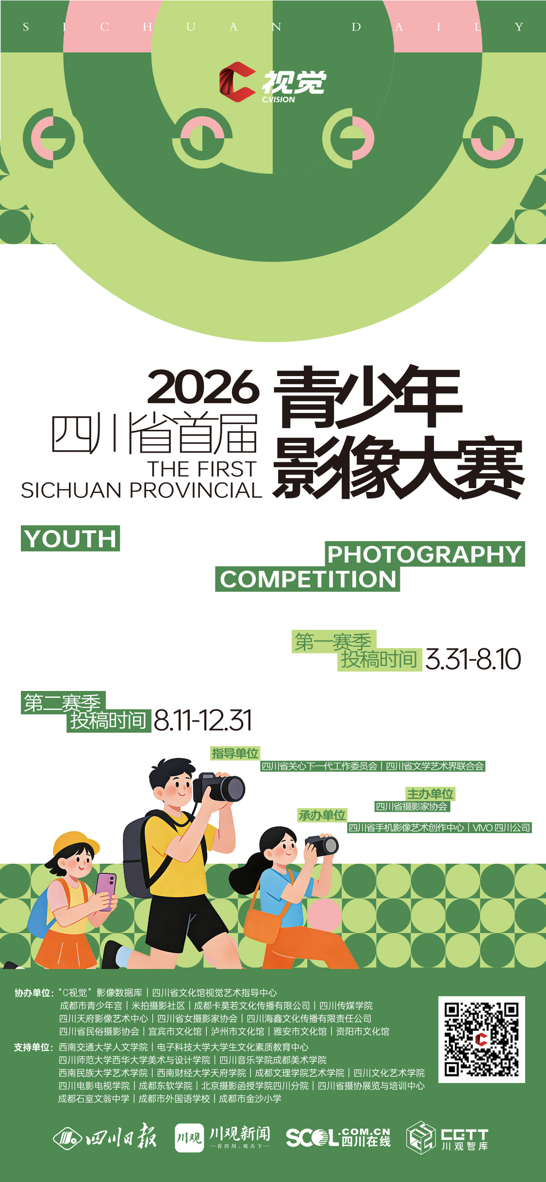 为深入贯彻党的教育方针,全面落实立德树人根本任务,坚定践行以美育人、以美化人、以美培元的时代要求,着力激发青少年群体对摄影艺术的浓厚兴趣,切实提升其观察感知、艺术创作与审美鉴赏能力,有效唤起青少年探索世界、记录美好的内在热情,助力培养青少年对摄影艺术的热爱与追求,充分展现新时代青少年的审美视界与精神风貌。由四川省关心下一代工作委员会、四川省文学艺术界联合会指导,四川省摄影家协会主办、“C视觉”影像数据库作为征集平台的四川省首届青少年影像大赛正式启动,面向广大青少年朋友进行征稿。