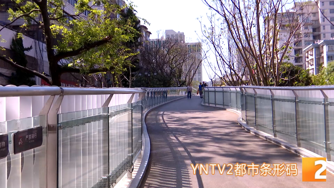 沿着登华街往黄公东街方向走,架空栈道两侧种满蓝花楹树,游客行走在栈道上,可以与蓝花楹近距离接触,不少人忍不住拿出手机拍照打卡。架空栈道全长600多米,设有3个上下口,去年底才正式开放。等到蓝花楹进入盛花期,市民游客就能在“空中”邂逅蓝花楹花海,欣赏昆明“满城春色半城紫”的美景。