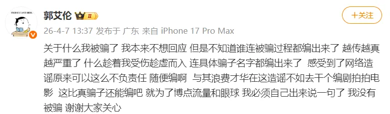 郭艾伦写道:关于什么我被骗了,我本来不想回应,但是不知道谁连被骗过程都编出来了,越传越真越严重了,什么趁着我受伤趁虚而入,连具体骗子名字都编出来了,感受到了网络造谣原来可以这么不负责任,随便编啊,与其浪费才华在这造谣不如去干个编剧拍拍电影,这比真骗子还能编吧,就为了博点流量和眼球,我必须自己出来说一句了,我没有被骗,谢谢大家关心!