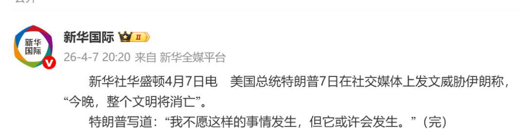 美国总统特朗普7日在社交媒体上发文威胁伊朗称,“今晚,整个文明将消亡”。