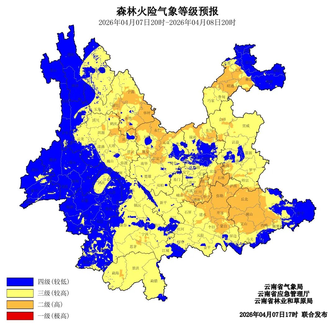 预计,2026年4月7日20时至2026年4月8日20时,丽江市东南部、大理州东北部、楚雄州北部、昆明市东南部和北部、玉溪市东部、红河州北部和中部、文山州西部和中部、昭通市中部二级(高),迪庆州东部、丽江市中西部、大理州中南部、楚雄州南部、临沧市北部、普洱市、西双版纳州、昆明市西部、玉溪市西部、红河州南部、曲靖市、昭通市南部三级(较高),其他地区四级(较低)。