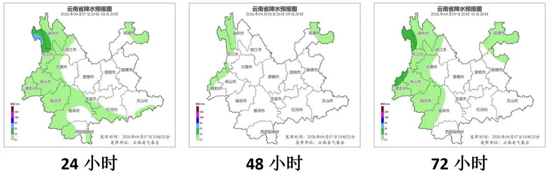 4月7日20时到4月8日20时:怒江州北部阴有小到中雨局部大雨,迪庆州、怒江州南部、丽江市西部、大理州西部、保山市、德宏州、临沧市、普洱市、西双版纳州、玉溪市南部、红河州南部、文山州南部、昭通市北部多云有阵雨局部中雨,其他地区晴间多云。