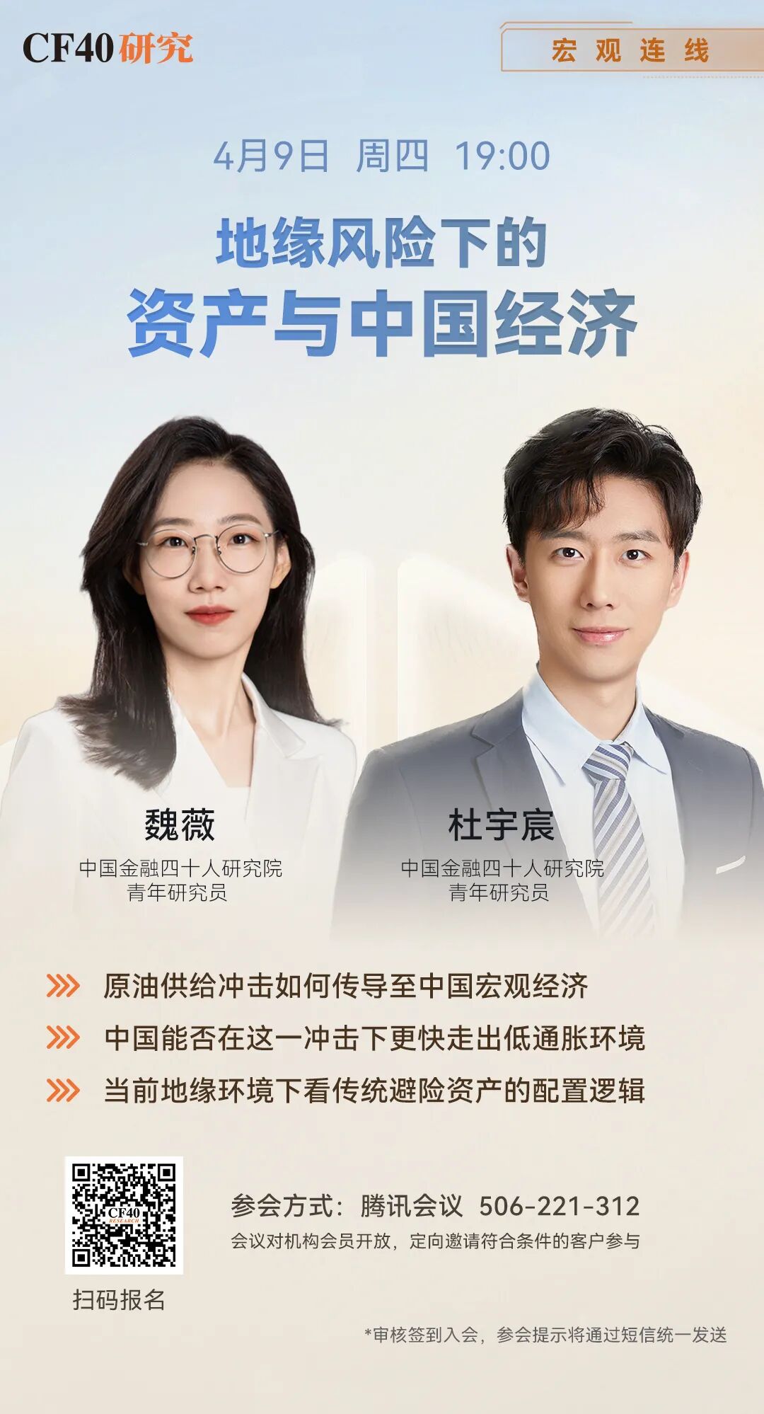 4月9日(本周四),中国金融四十人研究院将举办「宏观连线」电话会。本次连线的主题为地缘风险下的资产与中国经济,分享人为中国金融四十人研究院青年研究员魏薇、中国金融四十人研究院青年研究员杜宇宸。