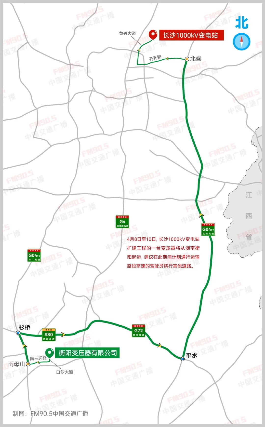 4月7日,记者从湖南省交通运输厅了解到,4月8日至10日,长沙1000kV变电站扩建工程的一台变压器将从湖南衡阳起运,期间,沿线高速公路将根据运输时间采取相应的管制措施,建议在此期间计划通行运输路段高速的驾驶员绕行其他道路。