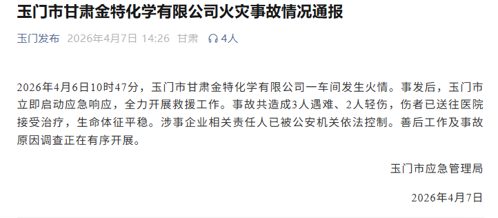 4月7日,甘肃省玉门市应急管理局发布通报称:4月6日10时47分,玉门市甘肃金特化学有限公司一车间发生火情。事发后,玉门市立即启动应急响应,全力开展救援工作。事故共造成3人遇难、2人轻伤,伤者已送往医院接受治疗,生命体征平稳。涉事企业相关责任人已被公安机关依法控制。善后工作及事故原因调查正在有序开展。