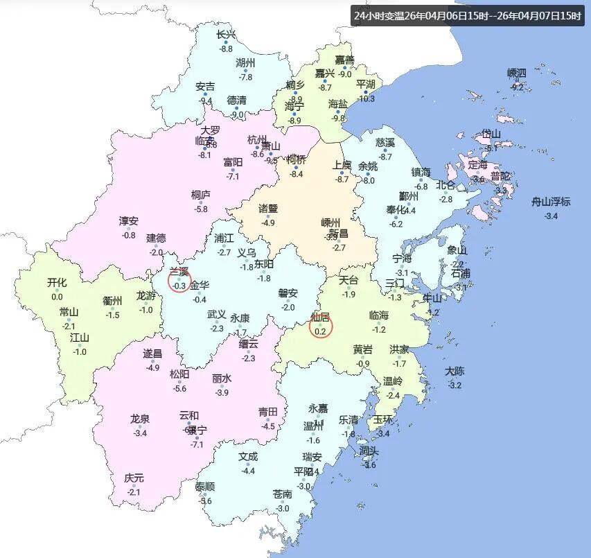 因为冷空气的影响,昨日我省出现明显降温。15时,全省气温较前一日同时均出现不同程度的下降,浙北地区尤为明显,普遍下降7-9℃,其中平湖降10.3℃。截至16时,我省最高气温沿海地区16-20℃,其他地区20-24℃,最高前三甲: