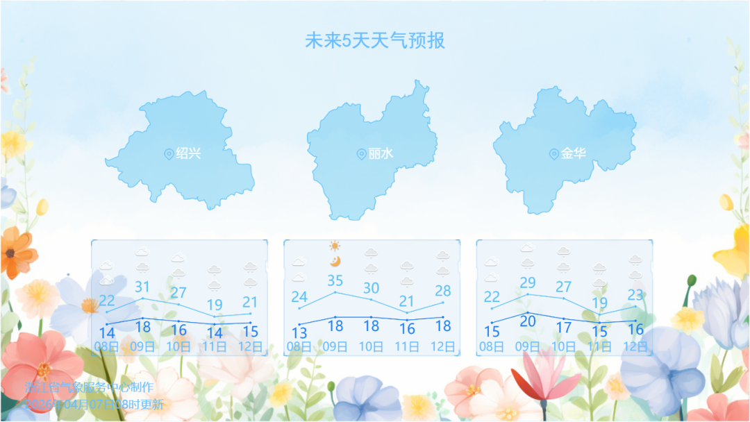 明天:浙北和浙中西部地区多云,傍晚到夜里转阴有阵雨或雷雨;其他地区多云,夜里局部阴有阵雨或雷雨。