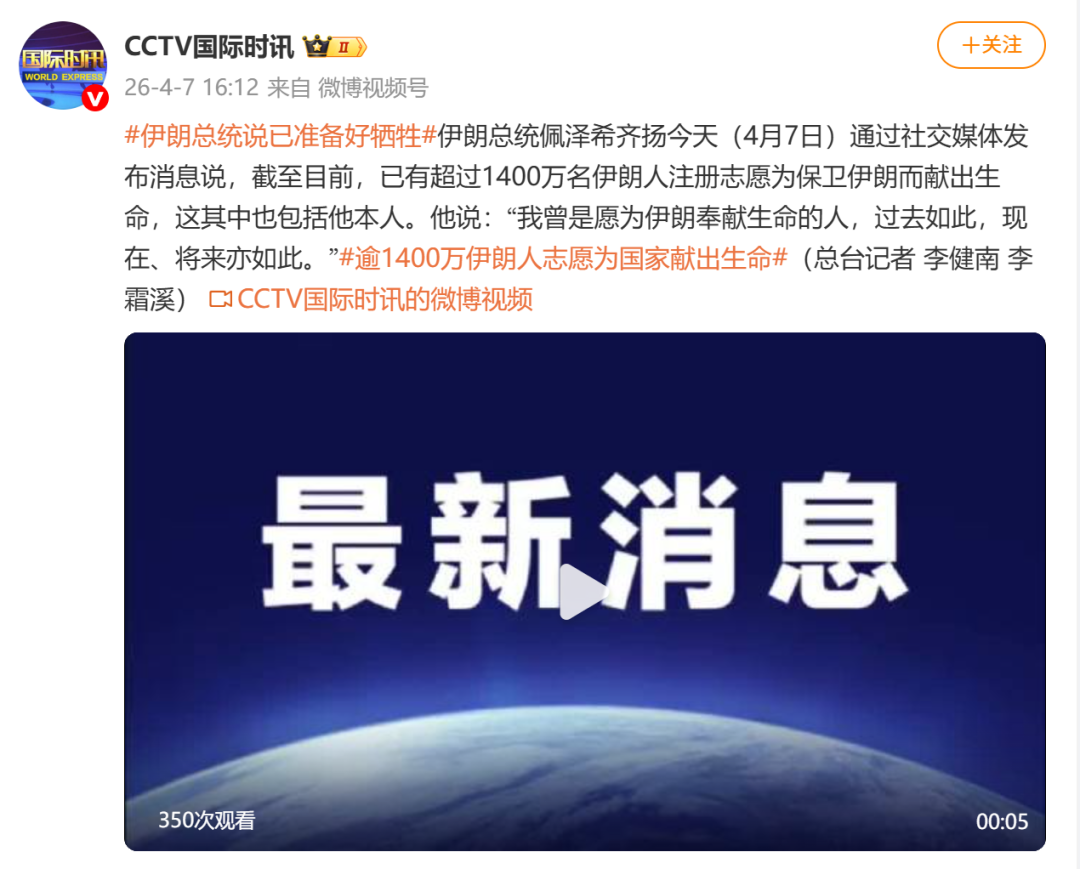 伊朗总统佩泽希齐扬今天(4月7日)通过社交媒体发布消息说,截至目前,已有超过1400万名伊朗人注册志愿为保卫伊朗而献出生命,这其中也包括他本人。他说:“我曾是愿为伊朗奉献生命的人,过去如此,现在、将来亦如此。”