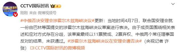 当地时间4月7日,联合国安理会就一份由巴林等国提交的涉霍尔木兹海峡决议草案进行表决。由于成员国围绕相关表述和应对方式存在分歧,该草案最终以11票赞成、2票弃权、中俄两个常任理事国反对的结果,未获通过。