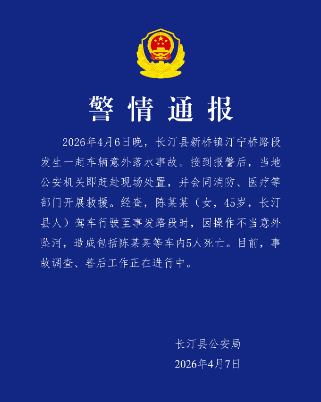 福建长汀县公安通报:2026年4月6日晚,长汀县新桥镇汀宁桥路段发生一起车辆意外落水事故。接到报警后,当地公安机关即赶赴现场处置,并会同消防、医疗等部门开展救援。经查,陈某某(女,45岁,长汀县人)驾车行驶至事发路段时,因操作不当意外坠河,造成包括陈某某等车内5人死亡。目前,事故调查、善后工作正在进行中。