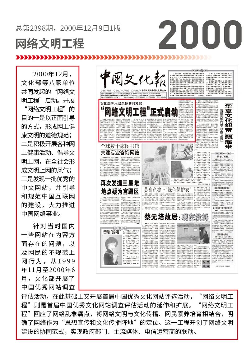 2000年12月,文化部等八家单位共同发起的“网络文明工程”启动。开展“网络文明工程”的目的一是以正面引导的方式,形成网上健康文明的道德规范;二是积极开展各种网上健康活动、倡导文明上网,在全社会形成文明上网的风气;三是发现一批优秀的中文网站,并引导和规范中国互联网的建设,大力推进中国网络事业。
