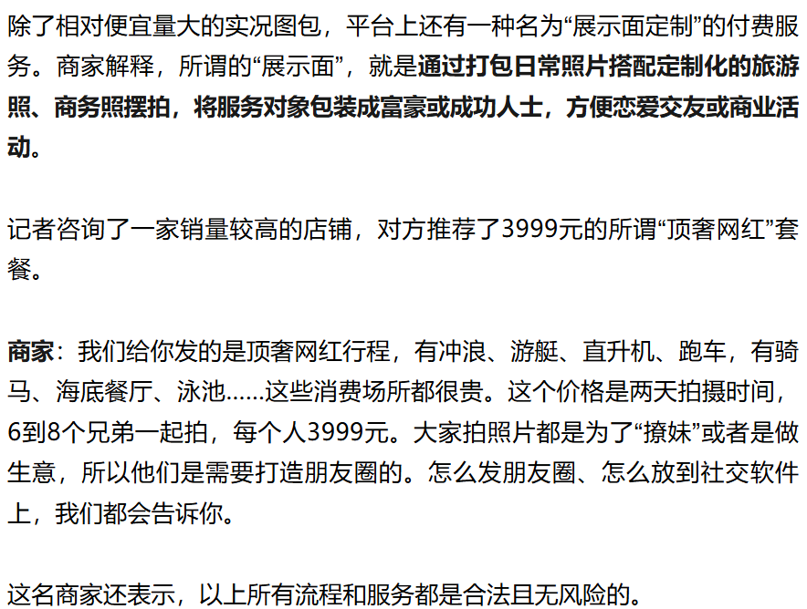 中国人民大学法学院教授 刘俊海:如果明明知道消费者就是用这种“富豪照”去欺骗他人、误导他人,依然提供这种“高大上”的照片,那实际上是有恶意重大过失的。如果将来有第三人因此而受损害,那参与恶意策划、执行,甚至是进行包装服务的商家也难辞其咎。