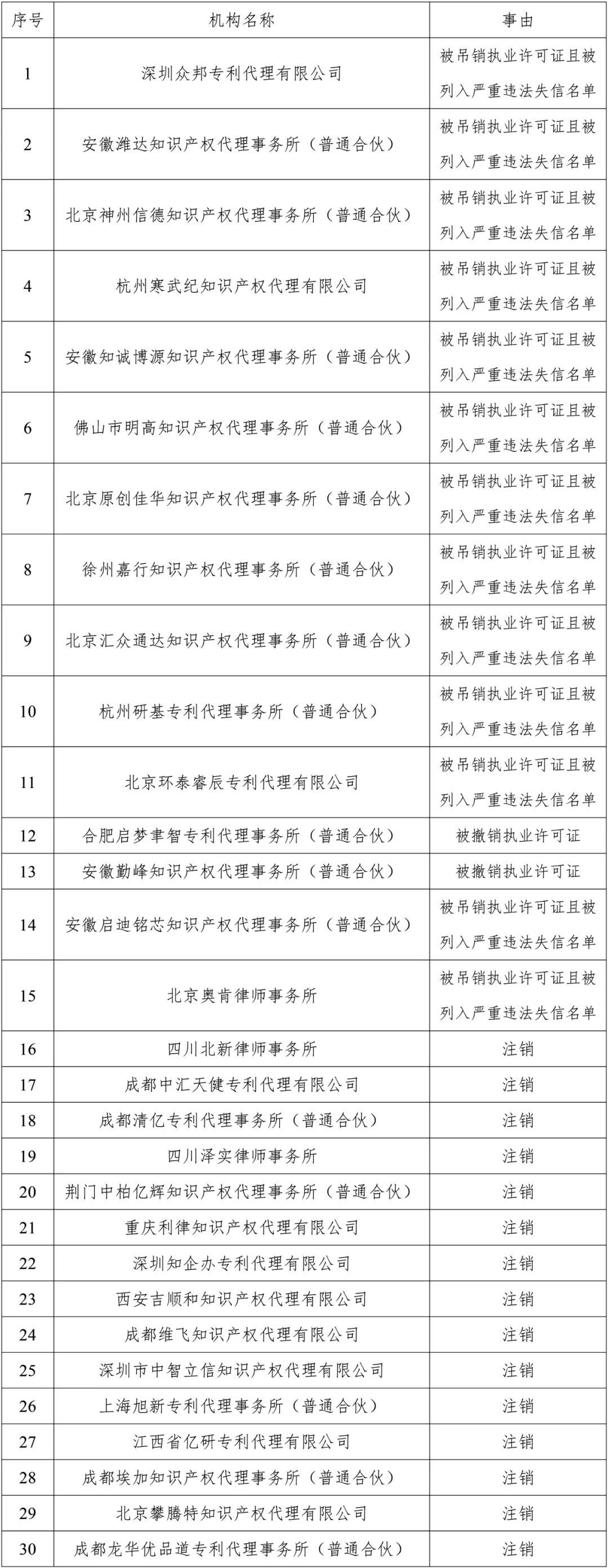 与此同时,四川北新律师事务所等15家机构因已注销,其专利申请预审代理资格也自即日起被取消。