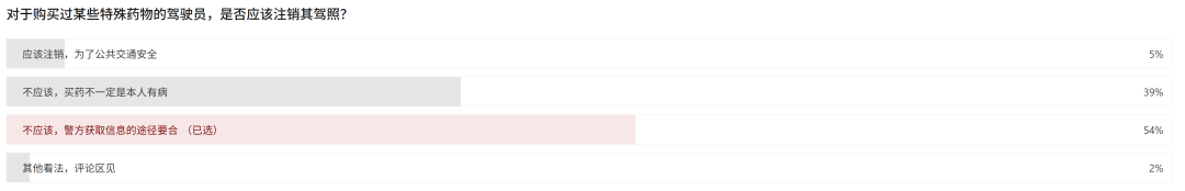 图:南方周末发起的有关“对于购买过某些特殊药物的驾驶员,是否应该注销其驾照?”投票结果,超一半网民认为警方获取信息的途径要合法