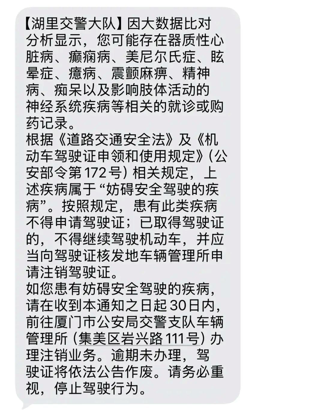 近日,厦门市发生一起市民因购买助眠药物后收到交警部门短信被通知注销驾驶证的事件。短信内容显示,交警部门通过大数据分析,认为该市民可能存在妨碍安全驾驶的疾病,故要求其在规定时间内办理注销手续,否则将公告作废。3月30日,厦门市湖里区交警部门工作人员表示,确实有发送此类短信,已有多人咨询。该短信只是出于安全提醒,驾驶员接到信息后,建议前往辖区交警部门进一步核实,或需要签署承诺书或开具医院证明。