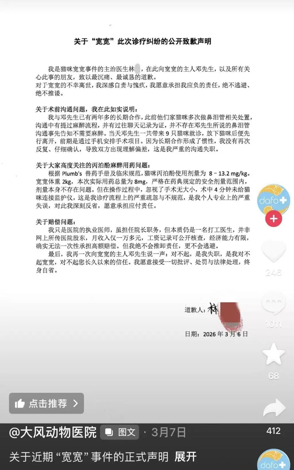 3月7日,涉事宠物发布了“宽宽”的主治医生林某的致歉声明。截图