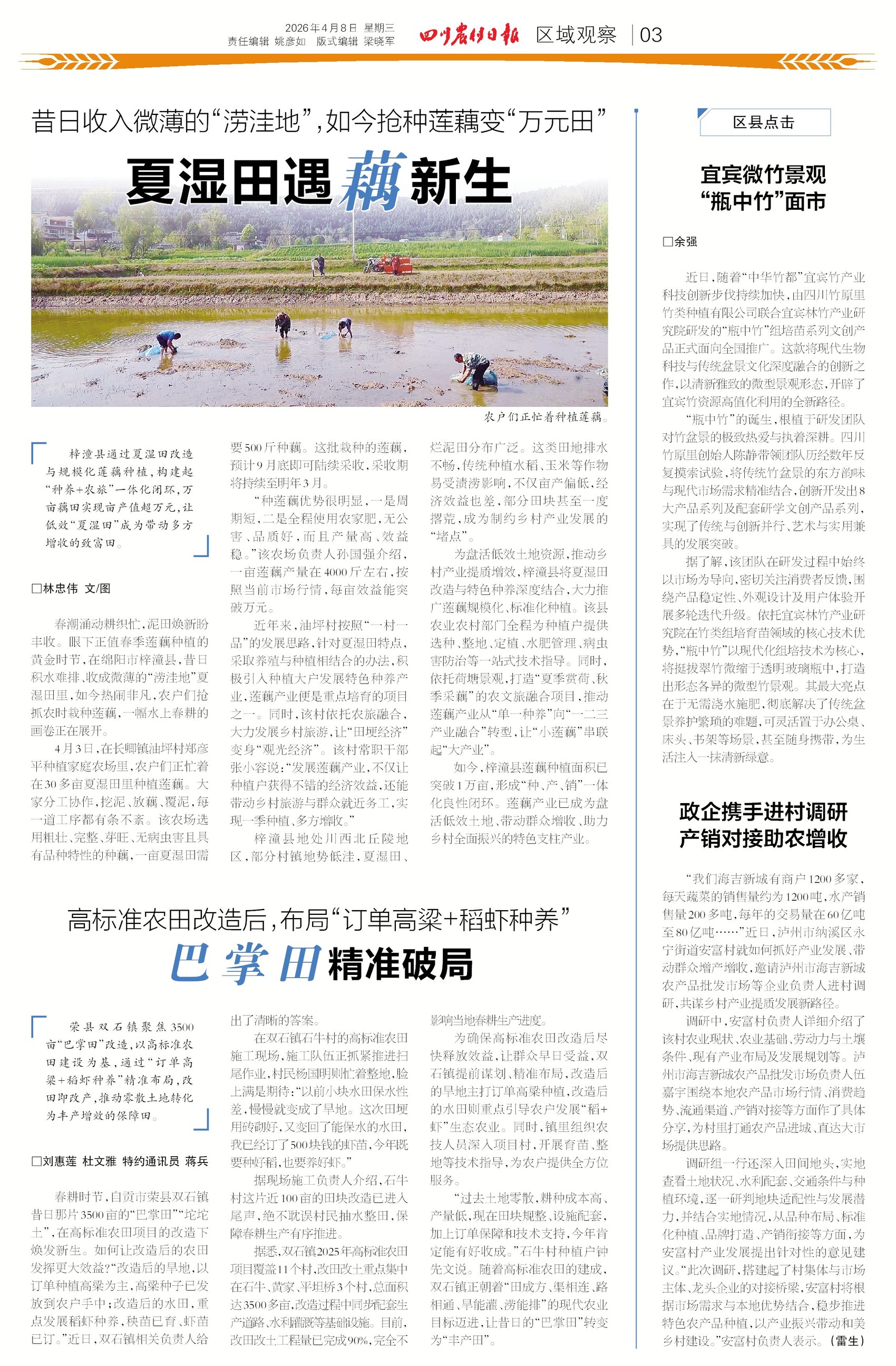 曾经积水难排的“烂泥田”,如今一亩莲藕收入上万元;宜宾还搞出“瓶中竹”——不用浇水施肥,办公桌就能养微型竹林。四川的农田里,惊喜比春笋还多!