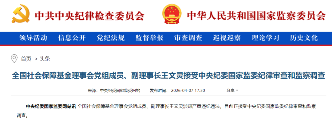 全国社会保障基金理事会党组成员、副理事长王文灵涉嫌严重违纪违法,目前正接受中央纪委国家监委纪律审查和监察调查。