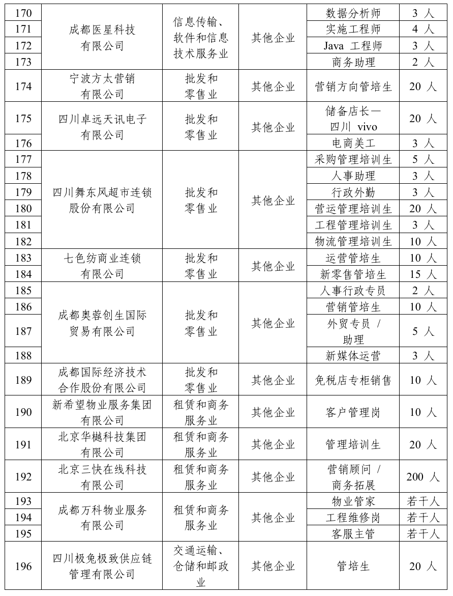 本次招聘会线上线下同时进行。线下招聘活动时间是4月10日9:00—12:00,地点在成都大学;线上招聘活动时间是4月10日—5月20日,毕业生可登录“川e就—四川大学生就业服务平台”参加。活动邀请事业单位、国有企业、民营企业等各类优质用人单位齐聚纳才,涵盖教育、金融、信息技术、装备制造等多个领域,超多岗位总有一个适合你!