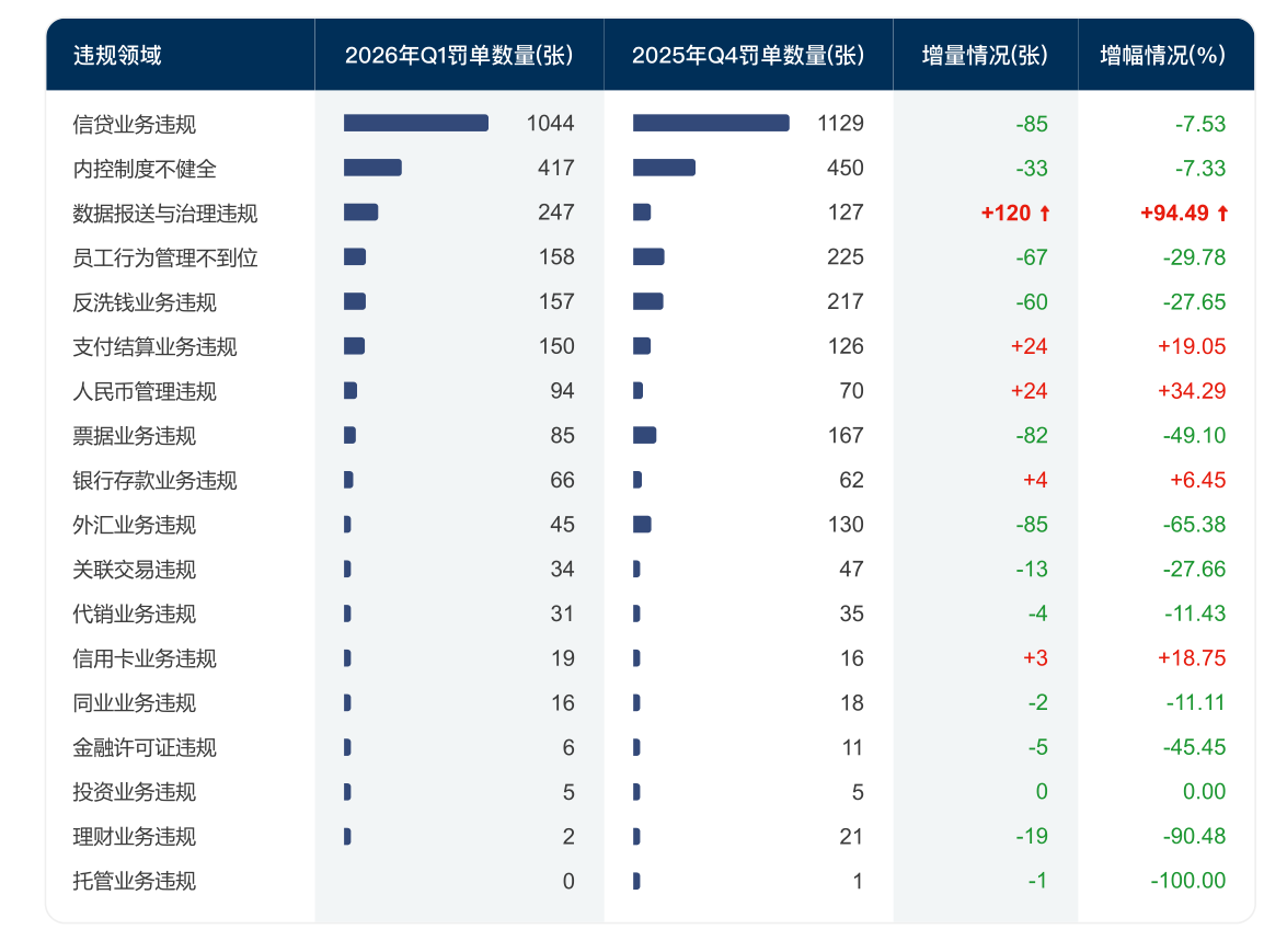从违规类型来看,信贷业务违规数量虽然环比上季度有所下降,但依然是银行违规的重灾区。2026年一季度,信贷业务违规罚单数量为1044张,环比上季度减少了85张,具体违规案由包括贷款三查未尽职、违规办理或发放贷款、信贷资产分类不准确、违规处置或掩盖不良资产等。比如,国家金融监督管理总局浙江省监管局今年2月6日对杭州联合农商行开出了1110万元的罚单,16名相关责任人也被同时追责,贷款管理不到位是其主要违法违规事由之一。