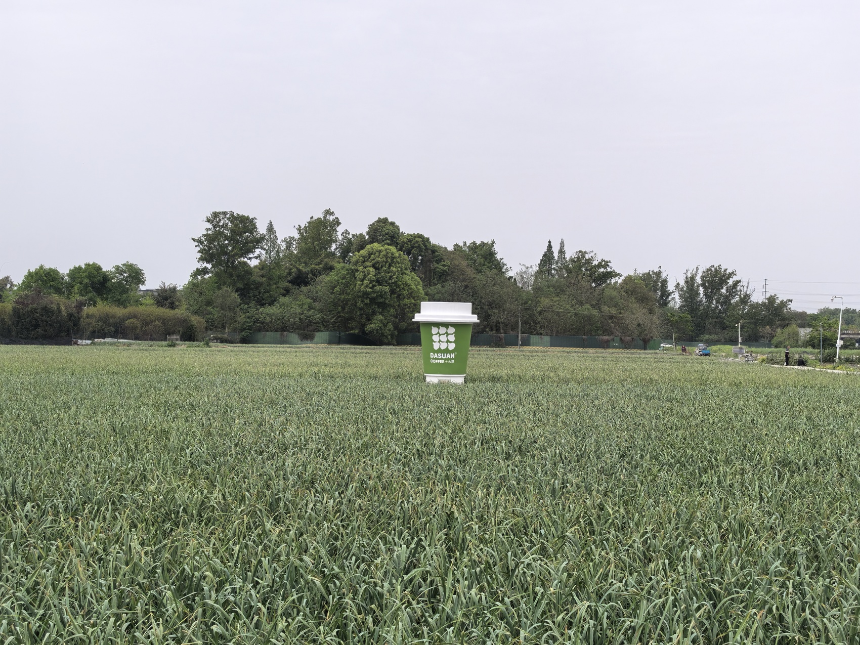 高山村里的大蒜田和大蒜咖啡杯标识。