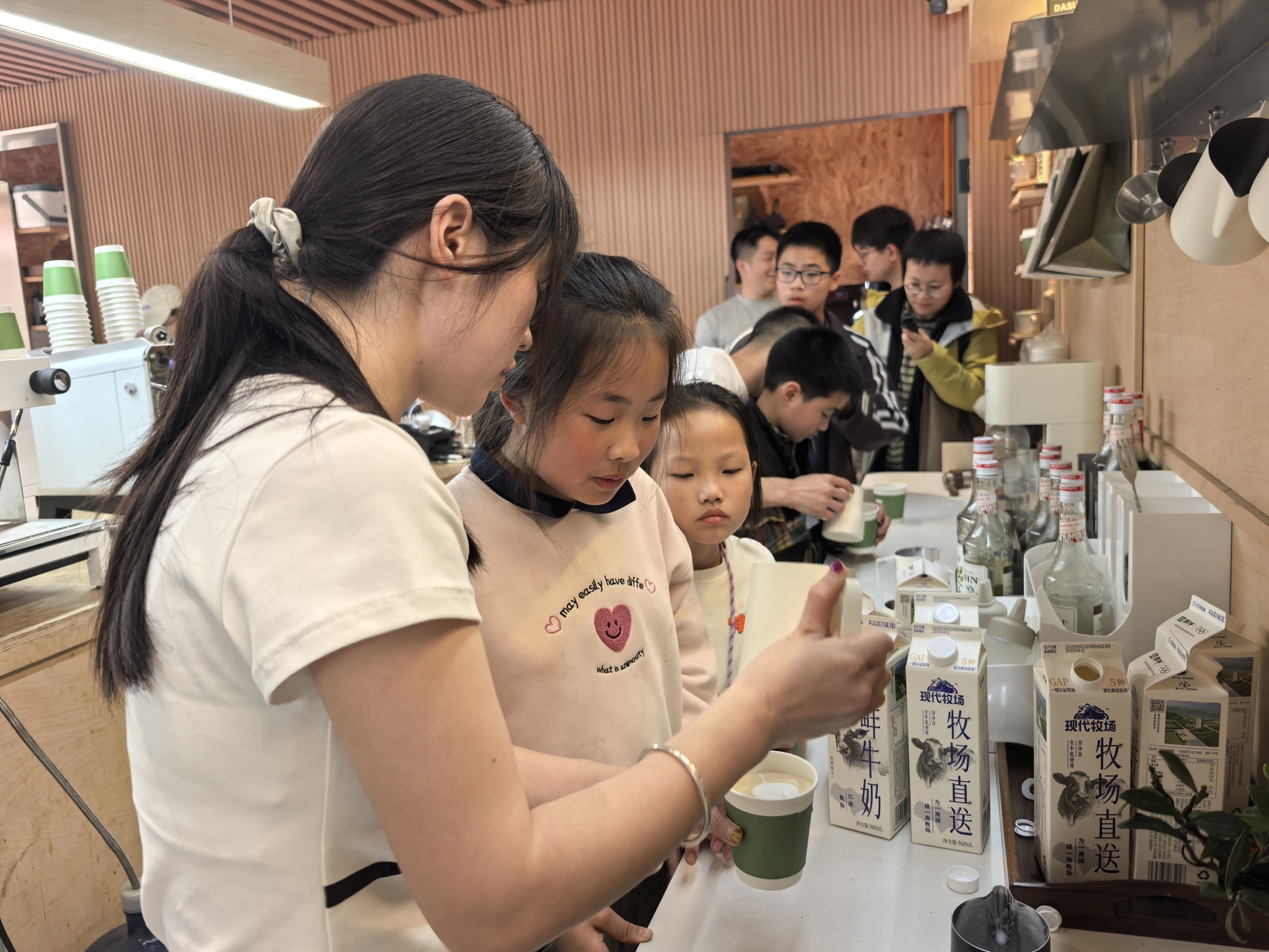 在大家满眼的期待下,“大蒜咖啡”团队的小伙伴们加快了萃取浓缩液的节奏,动作麻利地完成拉花,将一杯杯香气四溢的“大蒜咖啡”递到他们手中,再耐心指导大家铺上一层焦香蒜末。