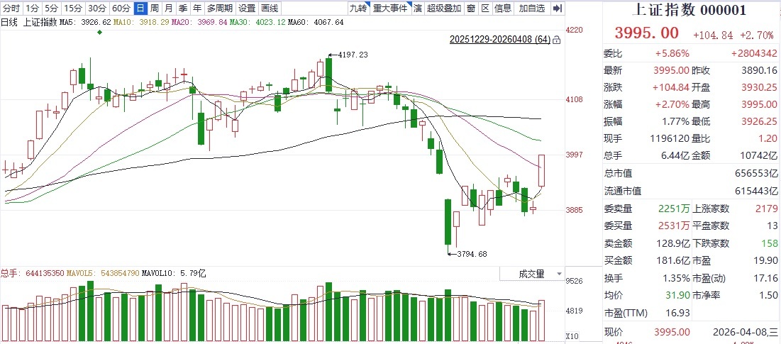 消息一出,之前一直紧绷的中东地缘紧张情绪明显缓解。随着影响A股市场的外部变量出现缓和,A股三大股指集体走高,刷新了中东战事爆发以来的最大单日涨幅。上证指数4月8日高开后一路走高,不仅轻松突破3936点强压力位,同时还顺利站上了行情短期分水岭的20日均线,最终在全日最高点收盘,距离4000点整数关口仅一步之遥。