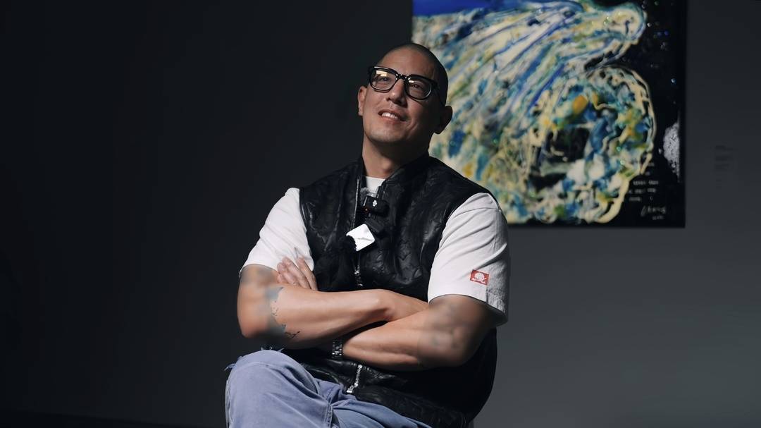 这最直观体现在他作品的材料里。不同于传统绘画使用的颜料,亚克力、树脂、汽车烤漆等等材料都能被叠加在他的画作中,他把这种过程称为“探险”。逻辑很简单,没人会这样混合使用工业材料,所以出现的效果自然无法预料,而这刚好跟泼彩的概念相同,“你看,每次画画都是一场探险,材料碰撞出的盘漆与变化,是无法预设的。”