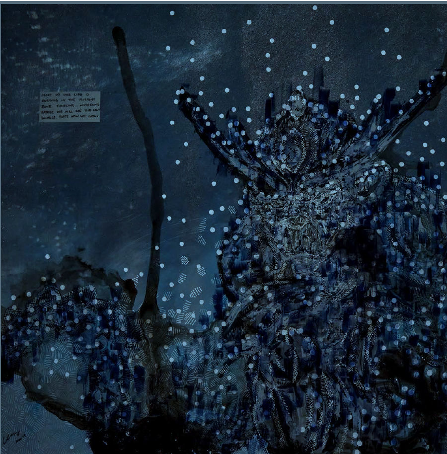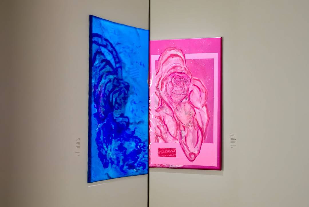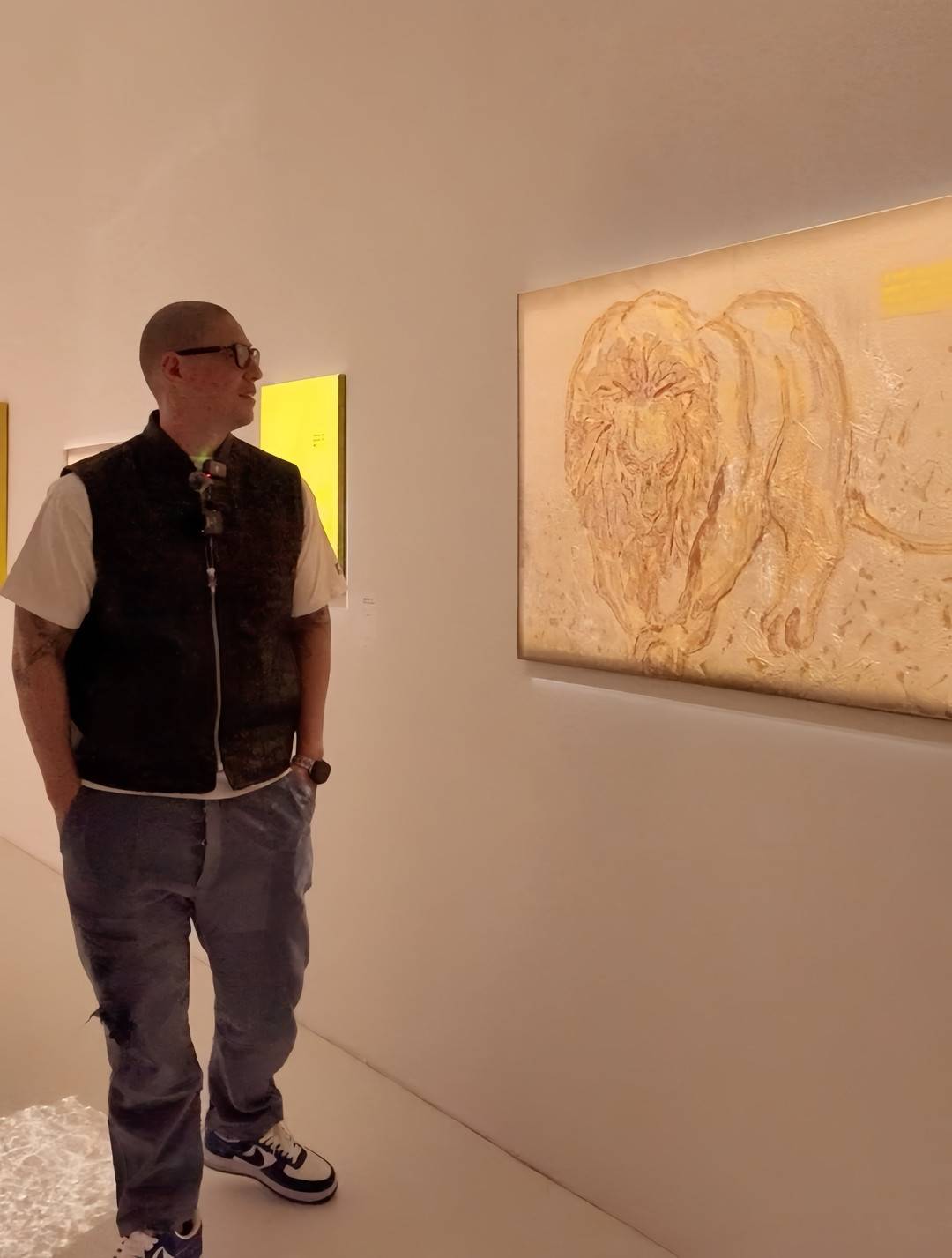在他的作品里,冷峻的单色肌理旁,有感性的题词。如威严老虎旁,写着“我曾一直寻找自己是谁,或自己应该成为谁,直到有一天,我累到再也无力寻找。那时我才明白,我不需要成为任何人,只要接纳做自己就好。”