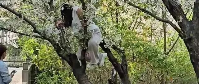 别人是人在花中笑,这位是树为人折腰,拍照五分钟,丢人一辈子,这“出片率”真高!