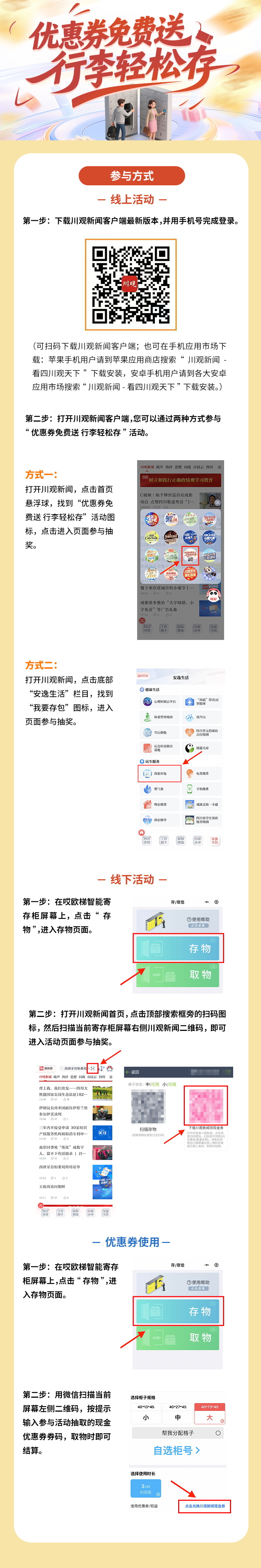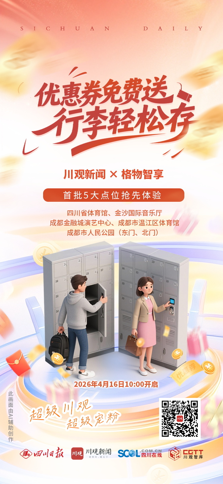 春风拂面,出游正当时。4月16日,川观新闻携手格物智享推出“优惠券免费送 行李轻松存”宠粉活动,1万张3元行李寄存优惠券倾情派送,贴心助力市民轻装出行。
