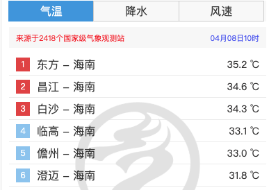 从4月4日开始,海南省气象局持续发布高温四级预警。预计今天(8日)白天,海口、澄迈、临高、定安、屯昌、儋州、白沙、昌江和东方等9个市县的大部分乡镇,将出现37℃以上的高温天气。