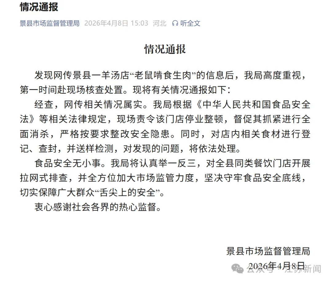 发现网传景县一羊汤店“老鼠啃食生肉”的信息后,我局高度重视,第一时间赴现场核查处置。现将有关情况通报如下: