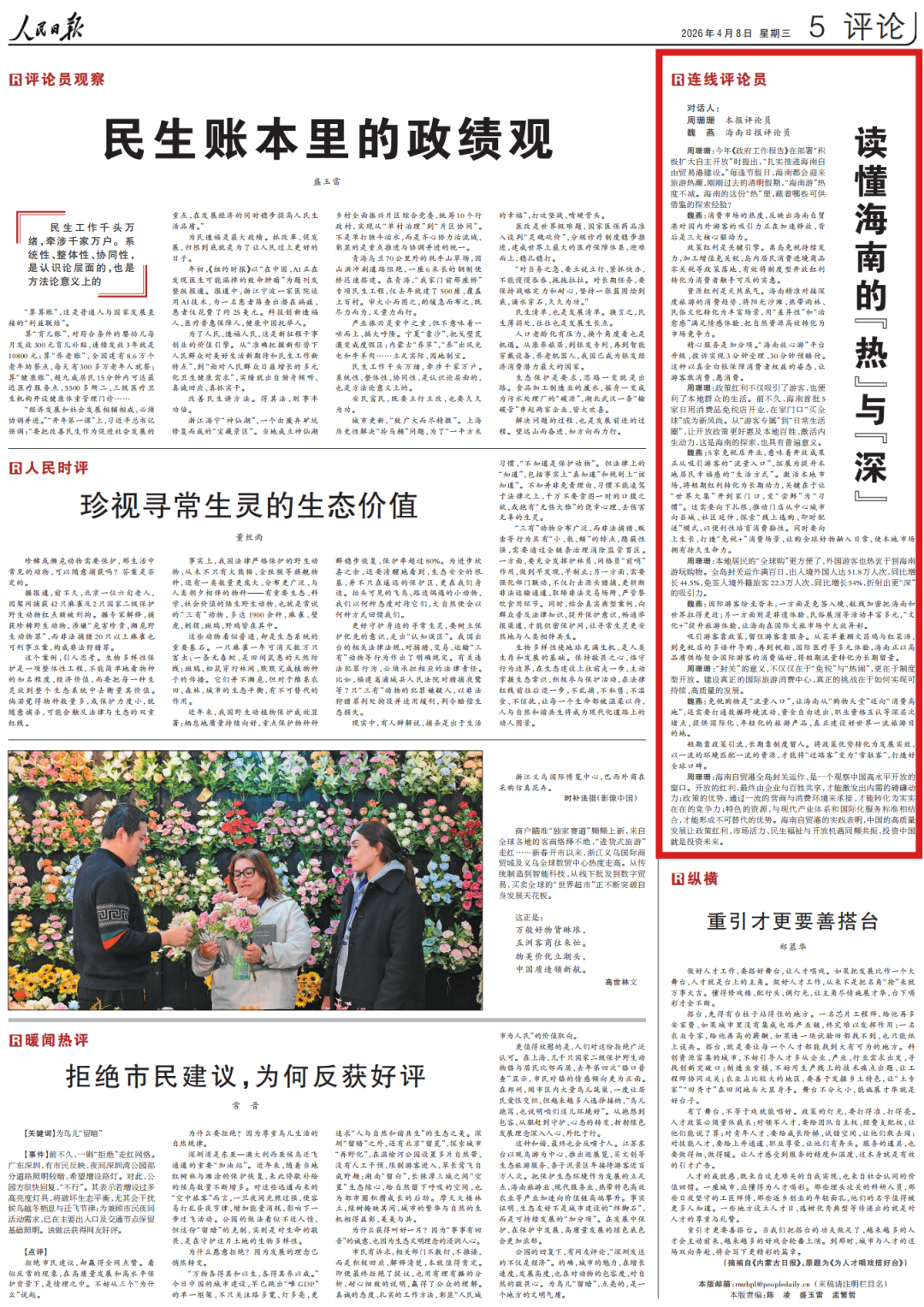 4月8日,人民日报第05版刊发文章《读懂海南的“热”与“深”(连线评论员)》,版面图及全文如下: