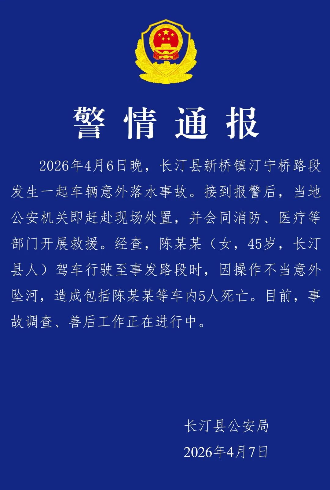 2026年4月6日晚,长汀县新桥镇汀宁桥路段发生一起车辆意外落水事故。接到报警后,当地公安机关即赶赴现场处置,并会同消防、医疗等部门开展救援。经查,陈某某(女,45岁,长汀县人)驾车行驶至事发路段时,因操作不当意外坠河,造成包括陈某某等车内5人死亡。目前,事故调查、善后工作正在进行中。