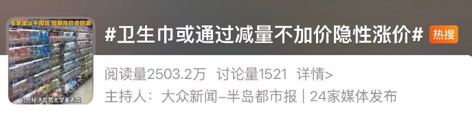 6日,#卫生巾或通过减量不加价隐性涨价 话题登上热搜引发关注。