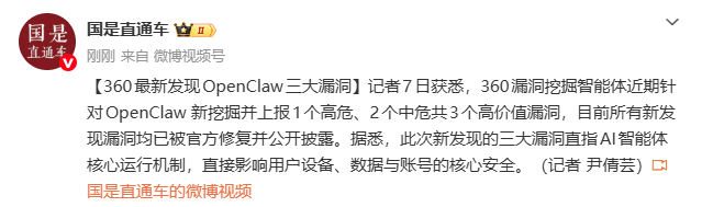 记者7日获悉,360漏洞挖掘智能体近期针对OpenClaw 新挖掘并上报1个高危、2个中危共3个高价值漏洞,目前所有新发现漏洞均已被官方修复并公开披露。据悉,此次新发现的三大漏洞直指AI智能体核心运行机制,直接影响用户设备、数据与账号的核心安全。
