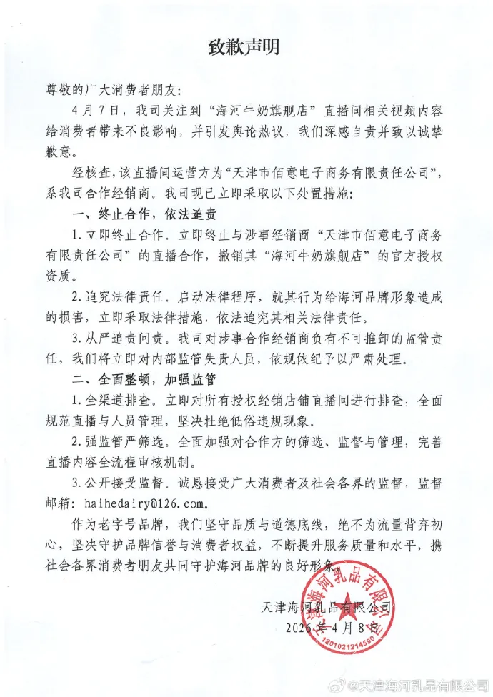 4月8日,针对直播间主播带货时言论低俗涉黄,天津海河乳品有限公司发布致歉声明称,公司关注到“海河牛奶旗舰店”直播间相关视频内容给消费者带来不良影响,并引发舆论热议,公司深感自责并致以诚挚歉意。