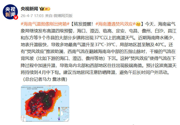 近期海南降水稀少,地表升温极快,导致多地最高气温升至37℃-39℃,局部地区甚至触及40℃。还有“焚风效应”推波助澜,西南气流在翻越海南岛中部的五指山脉时,干燥的气流在背风坡(比如下游的海口、澄迈、儋州等地)下沉。这种“焚风效应”使得气流在下降过程中加速升温,导致岛内北部和西部地区往往出现极端高值。