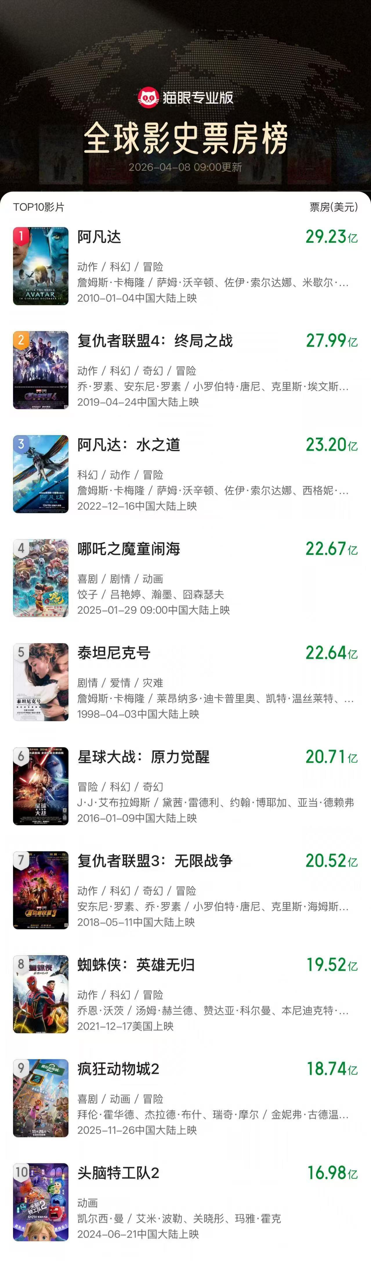 据猫眼专业版与Box Office Mojo最新统计,截至2026年4月8日,国产动画电影《哪吒之魔童闹海》(简称《哪吒2》)全球累计票房达22.67亿美元,以0.03亿美元的优势,超越经典影片《泰坦尼克号》(22.64亿美元),正式升至全球影史票房榜第四位。
