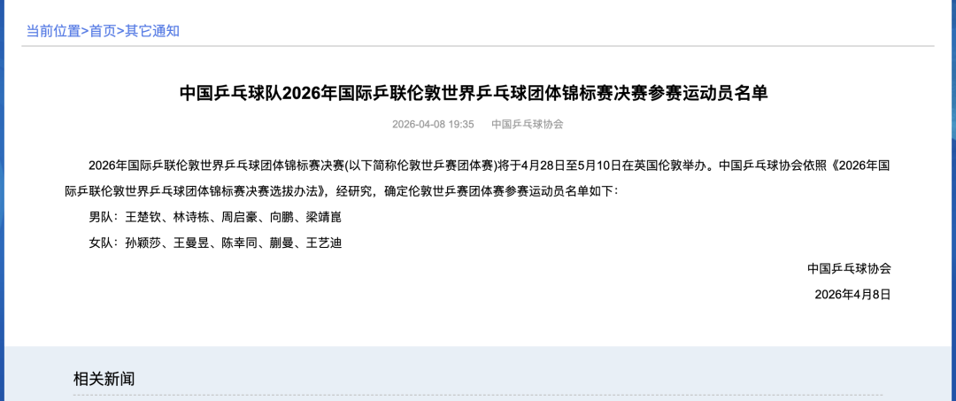 本届世乒赛将于4月28日至5月10日在英国伦敦举办。中国乒协表示,依照《2026年国际乒联伦敦世界乒乓球团体锦标赛决赛选拔办法》,经研究后确定了这份参赛运动员名单。