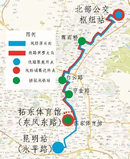 调整后:北部公交枢纽站 ↔ 拓东体育馆(东风东路)