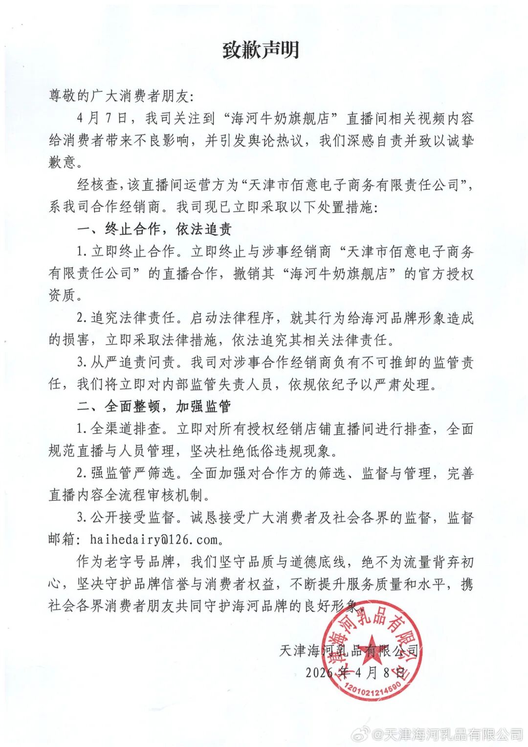 1.立即终止合作。立即终止与涉事经销商“天津市佰意电子商务有限责任公司”的直播合作,撤销其“海河牛奶旗舰店”的官方授权资质。